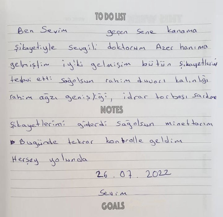 Ich kam letztes Jahr zu meinem lieben Doktor Azer Hanim mit der Beschwerde der Blutung. Ich bin dankbar, dass er alle meine Beschwerden behandelt hat, dank ihm, die Dicke der Gebärmutterwand, die Weite des Gebärmutterhalses, die Blasenschwäche. Heute kam ich wieder zur Kontrolle, alles ist gut.