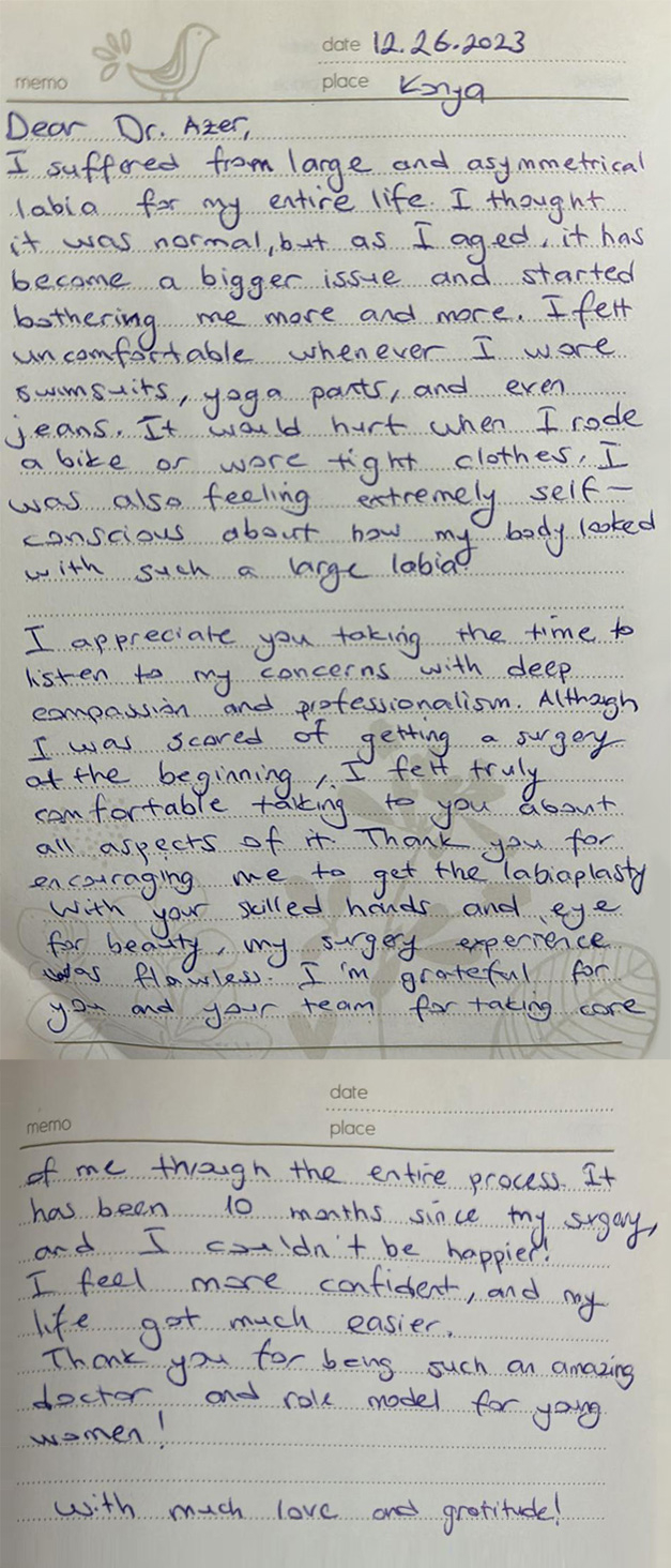 I appreciate you taking the time to listen to my concerns with deep compassion and professionalism. Although I was scared of getting a surgery at the beginning, I felt truly comfortable talking to you about all aspects of it. Thank you for encouraging me to get the labiaplasty. With your skilled hands and eye for beauty, my surgery experience was flawless. I am grateful for you and your team for taking care of me through the entire process. It has been 10 months since the surgery, and I couldn’t be happier! I feel more confident, and my life got much easier. Thank you for being such an amazing doctor and role model for other women!