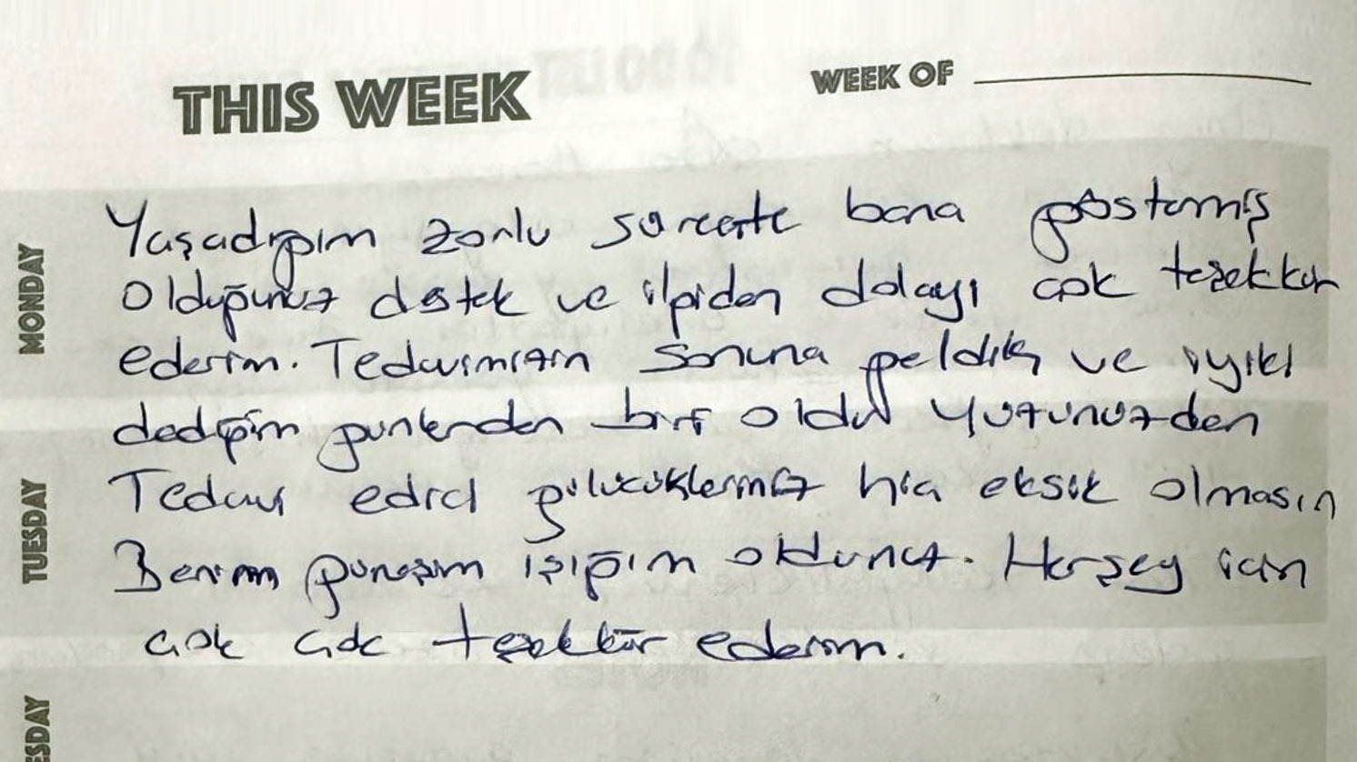 Yaşadığım zorlu süreçte bana göstermiş olduğunuz destek ve ilgiden dolayı çok teşekkür ederim. Tedavimizin sonuna geldik ve iyiki dediğim günlerden biri oldu. Yüzünüzden tedavi edici gülücükler hiç eksik olmasın. Benim güneş ışığım oldunuz. Herşey için çok çok teşekkür ederim.