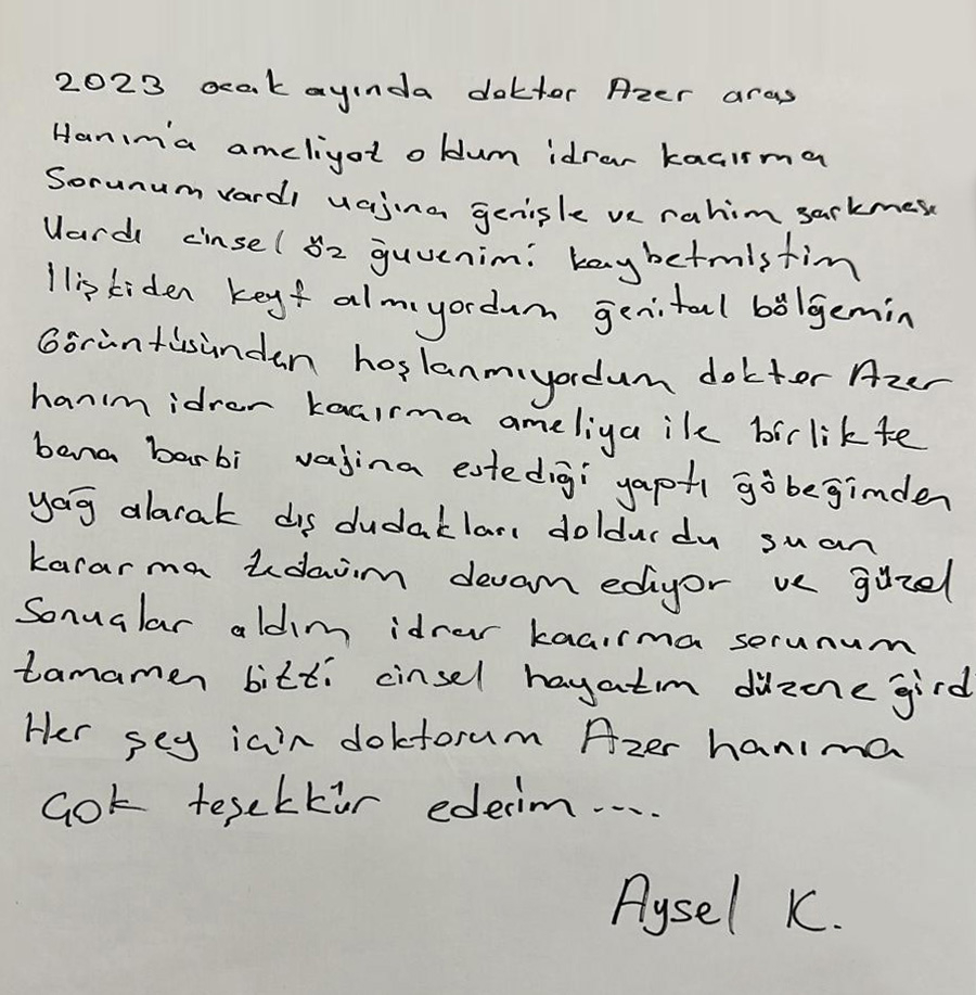 2023 Ocak ayında doktor Azer hanıma idrar kaçırma ameliyatı oldum. Vajina genişleme ve rahim sarkması durumu vardı. Ayrıca ilişkiden keyif alamıyordum. Genital bölgemin görüntüsünden hoşlanmıyordum. Doktor hanım idrar kaçırma ameliyatı ile birlikte barbie estetiği yaptırdım. Göbeğimden yağ alarak genital dış dudaklarımı doldurdu. Şuan kararma tedavim devam ediyor. İdrar kaçırma sorunum tamamen bitti. Cinsel hayatım düzeldi, çok teşekür ediyorum Azer hanıma.