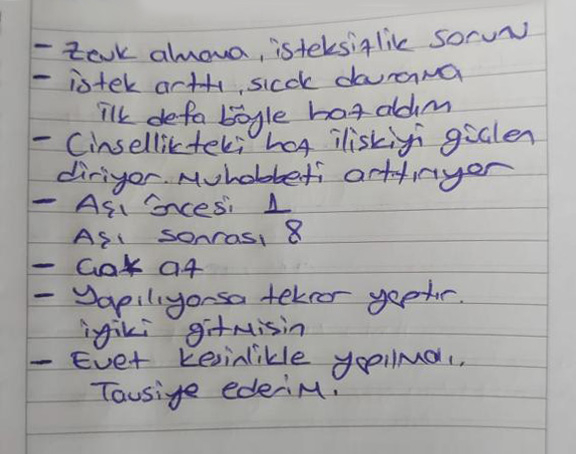 Zevk alamama, isteksizlik sorunu, istek arttı, sıcak davranma, ilk defa böyle bir haz aldım. Cinsellikte ki haz ilişkiyi güçlendiriyor, muhabbeti artırıyor. Orgazm aşısı öncesi 1, orgazm aşısı sonra 8. İyi ki gitmişim, evet kesinlike yapılmalı.