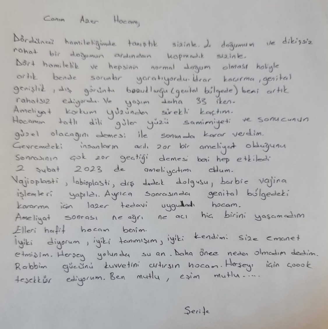 Dördüncü hamileliğimde tanıştık sizinle. 4. doğumun ve dikişsiz rahat bir doğumun ardından kopmadık sizinle. Dört hamilelik ve hepsinin normal doğum olması haliyle artık bende sorunlar yaratıyordu. İdrar kaçırma, genital genişlik, dış görüntü bozukluğu beni artık rahatsız ediyordu. 2 Şubat 2023'de ameliyatımı oldum. Vajinoplasti, labioplasti, dış dudak dolgusu, barbie vajina işleri yapıldı. Ayrıca sonrasında genital bölgedeki kararma için lazer tedavisi uygulası hocam. Ameliyat sonrası ne ağrı nede acı hiç birini yaşamadım. Elleri hafif hocam benim. İyiki diyorum, iyiki tanışmışım iyiki kendimi size emanet etmişim. Herşey için teşekkür ediyorum, ben mutlu, eşim mutlu...