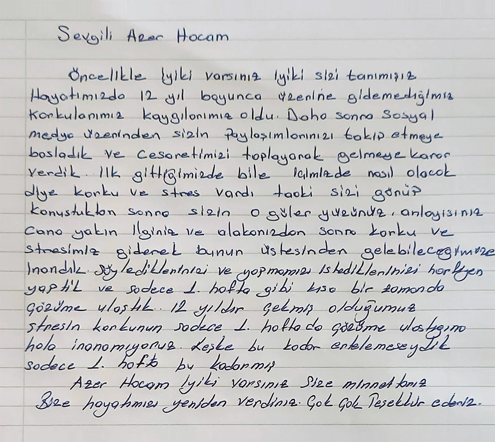 Sevgili Azer hocam, öncelikle iyiki varsınız iyi ki sizi tanımışım hayatımızda 12 yıl boyunca kaygılarımız oldu. Daha sonra sosyal medya üzerinden sizin paylaşımlarınızı takip etmeye başladık ve cesaretimizi toplayarak gelmeye karar verdim. İlk gittiğimizde bile içimizde nasıl olacak diye korku ve stres vardı taaki sizi görüp konuştuktan sonra sizin o güler yüzünüz anlayışınız cana yakın olmanız stresimizi gidererek bunun üstünden gelebileceğimizi inandık. Sadece 1 hafta gibi kısa bir sürede çözüme ulaştık. 12 yıldır çekmiş olduğumuz stresin korkunun sadece 1. haftada çözüme ulaştığına hala inanamıyoruz. Keşke bu kadar ertelemeseydik.