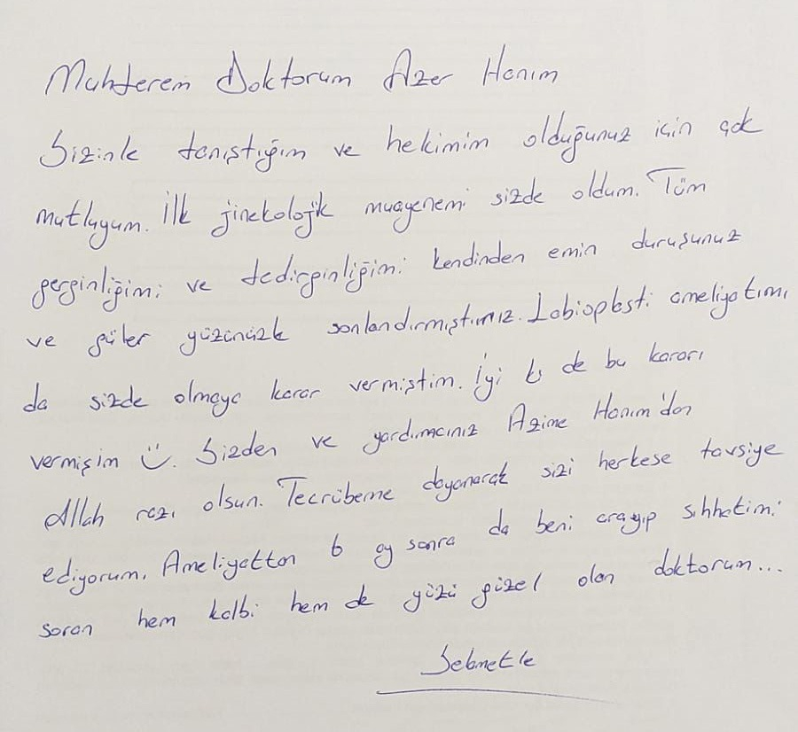 Sizinle tanıştığım ve hekimim olduğunuz için çok mutluyum. İlk jinekolojik muayenemi sizde oldum. Tüm gerginliğimi ve tedirginliğimi kendinden emin duruşunuz ve güler yüzünüzle sonlandırmıştınız. Labioplasti ameliyatımı da sizde olmaya karar vermiştim. İyi ki de bu kararı vermişim. Sizden ve yardımcınız Azime Hanım'dan Allah razı olsun. Tecrübeme dayanarak sizi herkese tavsye ediyorum. Ameliyattan 6 ay sonra da beni arayıp sıhhatimi soran hem kalbi hem de yüzü güzel olan doktorum.