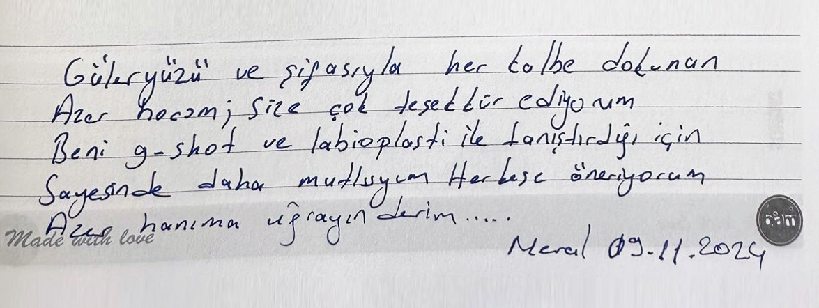 Güleryüzü ve şifasıyla her kalbe dokunan Azer hocam, size çok teşekkür ediyorum. Beni G-Shot ve Labioplasti ile tanıştırdığı için. Sayesinde daha mutluyum, herkese öneriyorum. Azer hanıma uğrayın derim.