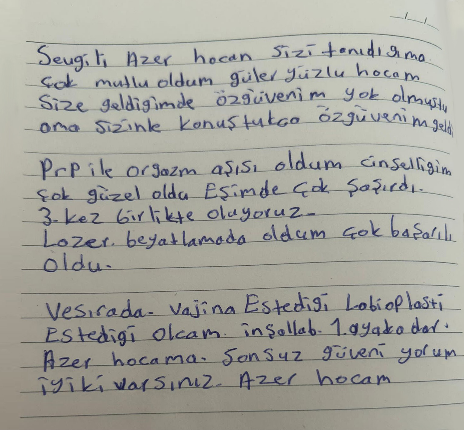 Sevgili Azer hocam sizi tanıdığıma çok mutlu oldum. PRP ile orgazm aşısı oldum, cinselliğim çok güzel oldu. Eşimde çok şaşırdı. 3. kez birlite oluyoruz. Lazer beyazlatmada oldum, çok başarılı oldu.