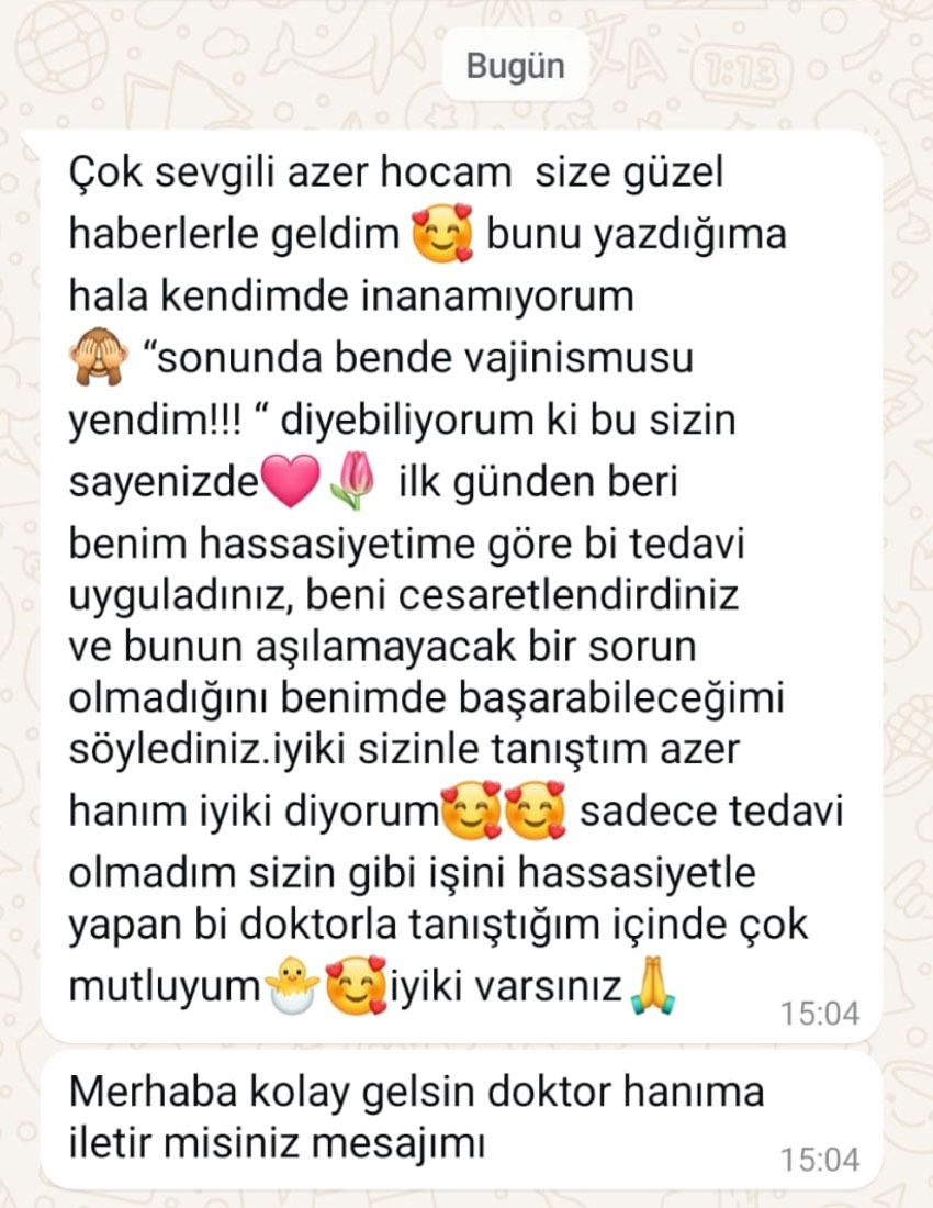 Çok sevgili azer hocam size güzel haberlerle geldim bunu yazdığıma hala kendimde inanamıyorum "sonunda bende vajinismusu yendim!!!" diyebiliyorum ki bu sizin sayenizde ilk günden beri benim hassasiyetime göre bi tedavi uyguladınız, beni cesaretlendirdiniz ve bunu aşılamayacak bir sorun olmadığını benimde başarabileceğimi söylediniz. iyiki sizinle tanıştım azer hanım iyiki diyorum sadece tedavi olmadım sizin gibi işini hassasiyetle yapan bir doktorla tanıştığım içinde çok mutluyum iyiki varsınız.